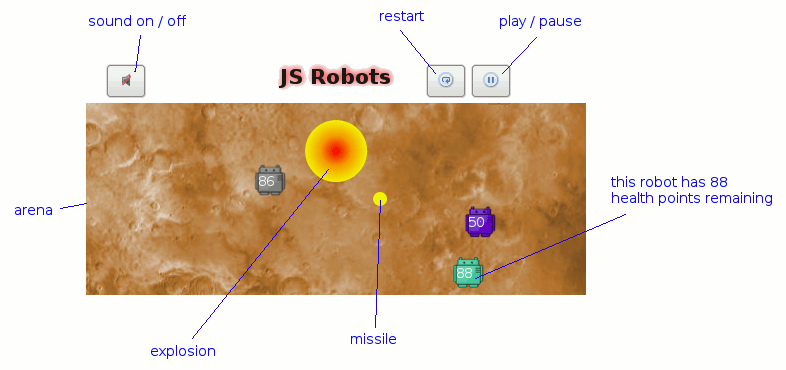It's a JavaScript reimagining of Tom Poindexter's seminal CROBOTS game. You program a script to control a robot and then put your robot up to fight against other CPU or human controlled robots each with various scripts!